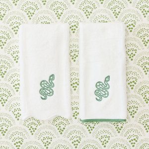 The perfect way to add a bit of personalization to your bathroom or complement your bath towels. Includes 2 Hand Towels. Features our signature piped edges. Designed with a hanging loop for quick drying between uses. Customized with our limited edition Green Snake icon.