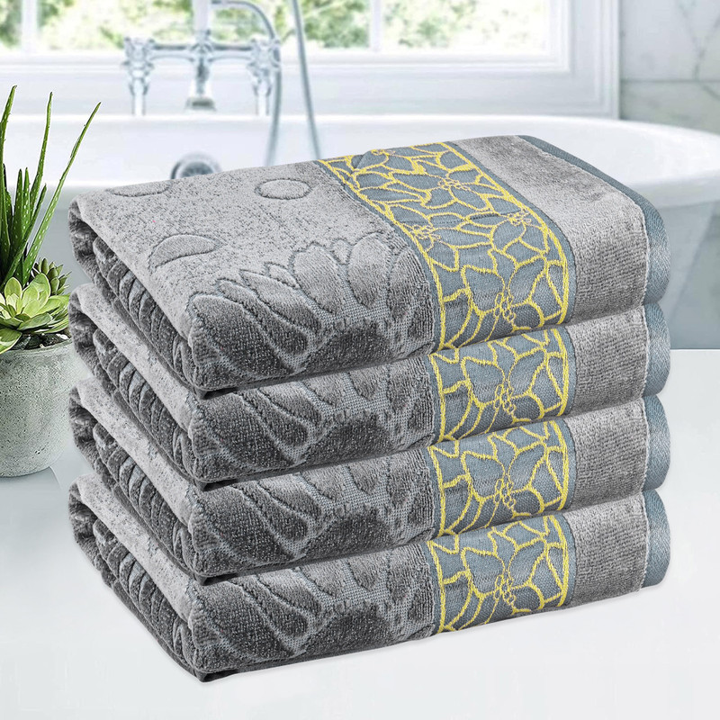 (4 Pcs) Bath Towels | Color – Grey | Golden Border Sark Plus | Material – Cotton | Product Dimensions – 152 cm x 76 cm x 1 cm