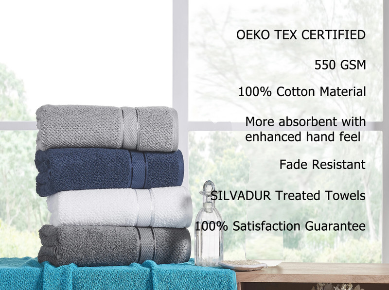 [SILVADUR TREATED TOWELS]:- These towels are made with pure, natural silver-coated fibers that are ultra-soft. The SILVADUR treatment technology penetrates the towel’s fibers to minimize odors , to provide an unmatched, long-lasting sense of freshness. This enhanced freshness means fewer washings are required which benefits you and the environment.